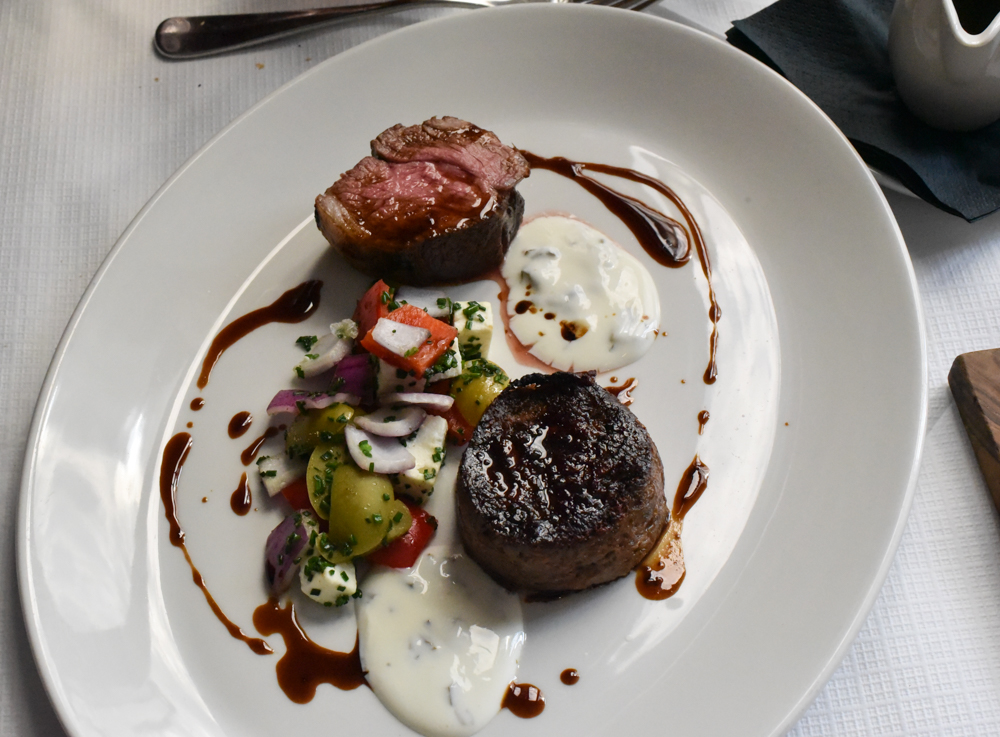 Main courses were seasonal too and Gemma chose a Cornish lamb cooked two ways both shoulder and rump with feta, peppers and mint yogurt. The meat was perfectly rare and the accompaniments gave the British dish a rather Mediterranean flair.