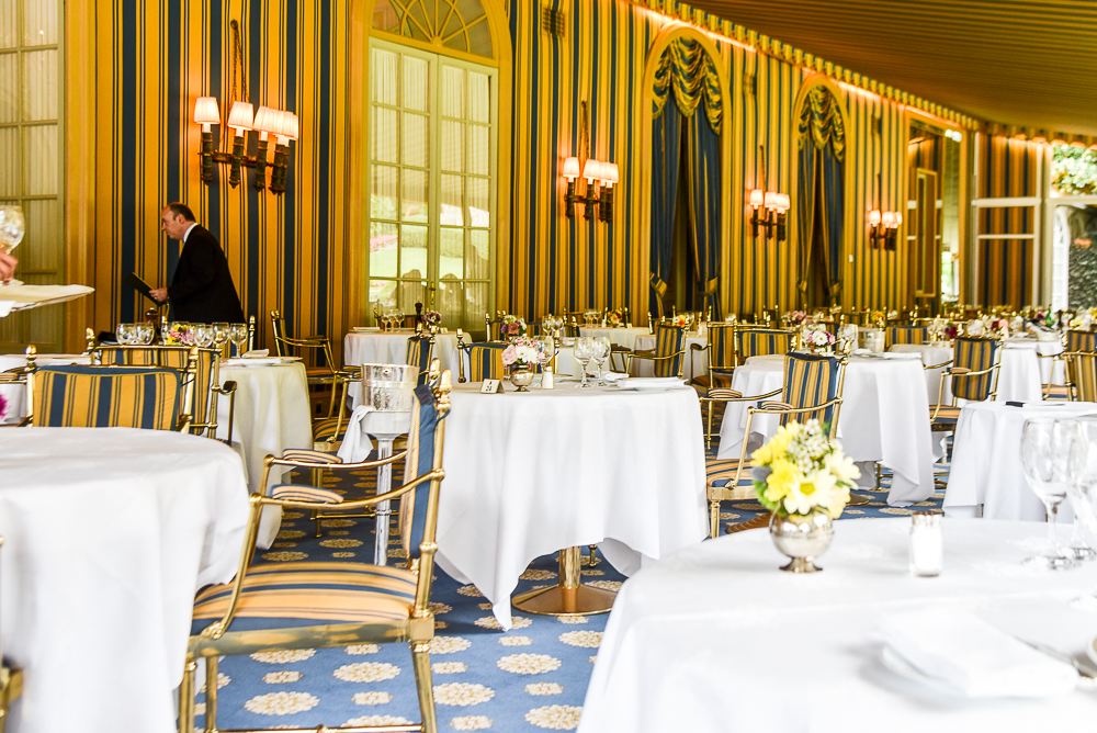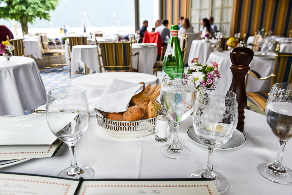 The first time that we visited, we had our lunch out here on the terrace – the perfect place for a view of that gorgeously romantic lake and watching the most elegant people-watching ever!! George prefers this more informal Grill area apparently!! But with rather moody skies today, we would be having lunch inside.